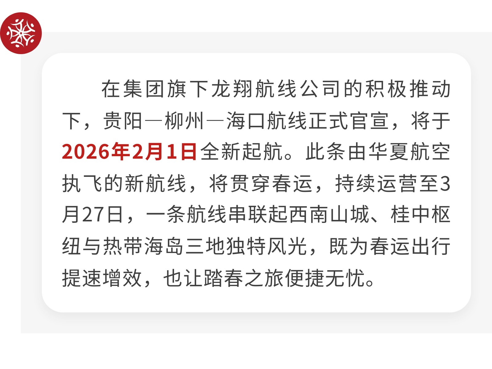 新春添新翼!龍翔航線公司成功開通貴陽—柳州—??谛峦ǖ? 發(fā)布時間:2026年01月15日 14時來源:本站原創(chuàng)瀏覽:66 人次