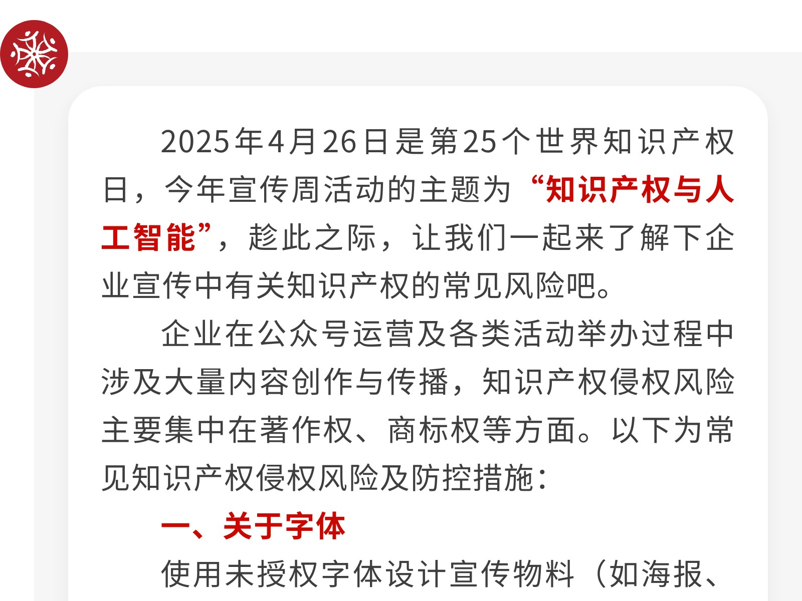 【全國知識產(chǎn)權(quán)宣傳周】提高知識產(chǎn)權(quán)意識,守住企業(yè)合規(guī)底線 發(fā)布時間:2025年04月28日 16時來源:本站原創(chuàng)瀏覽:95 人次