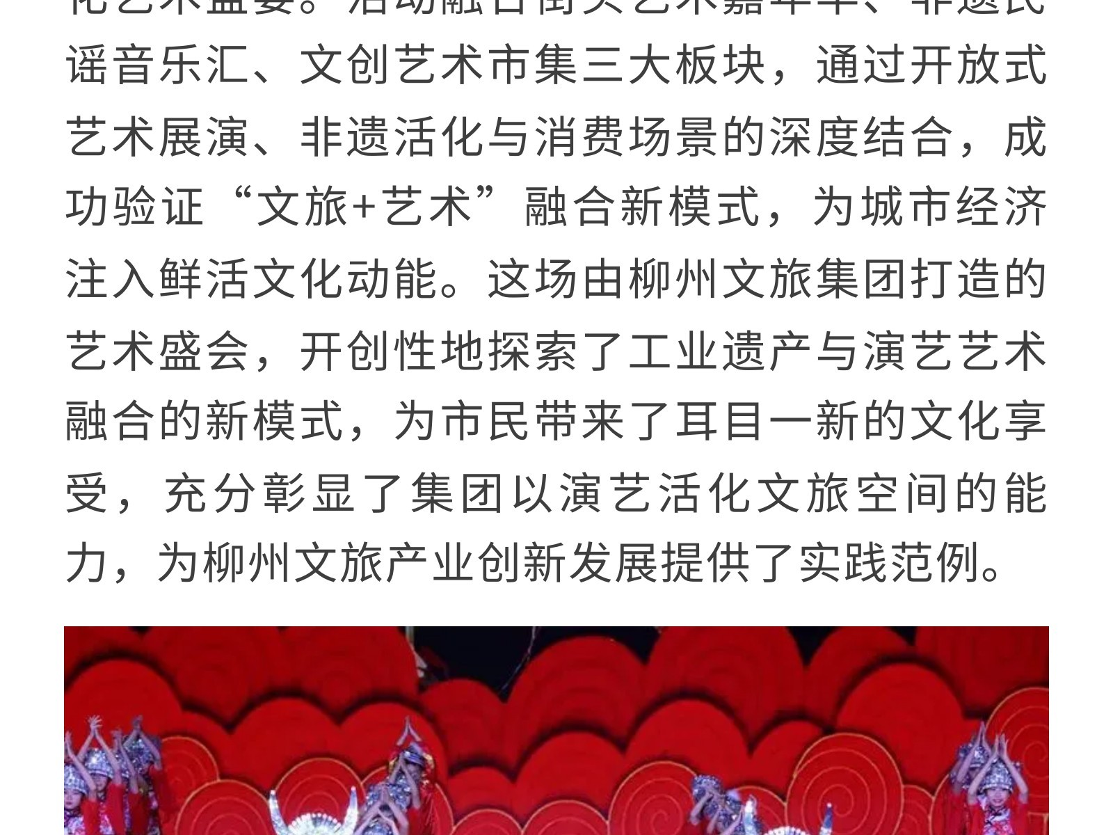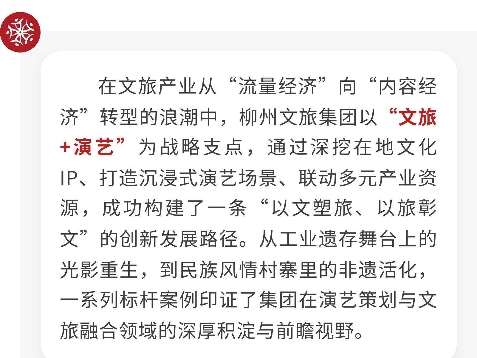 文旅融合新篇章:柳州文旅集團(tuán)以演藝為媒,激活城市文化基因 發(fā)布時(shí)間:2025年09月26日 10時(shí)來源:本站原創(chuàng)瀏覽:66 人次