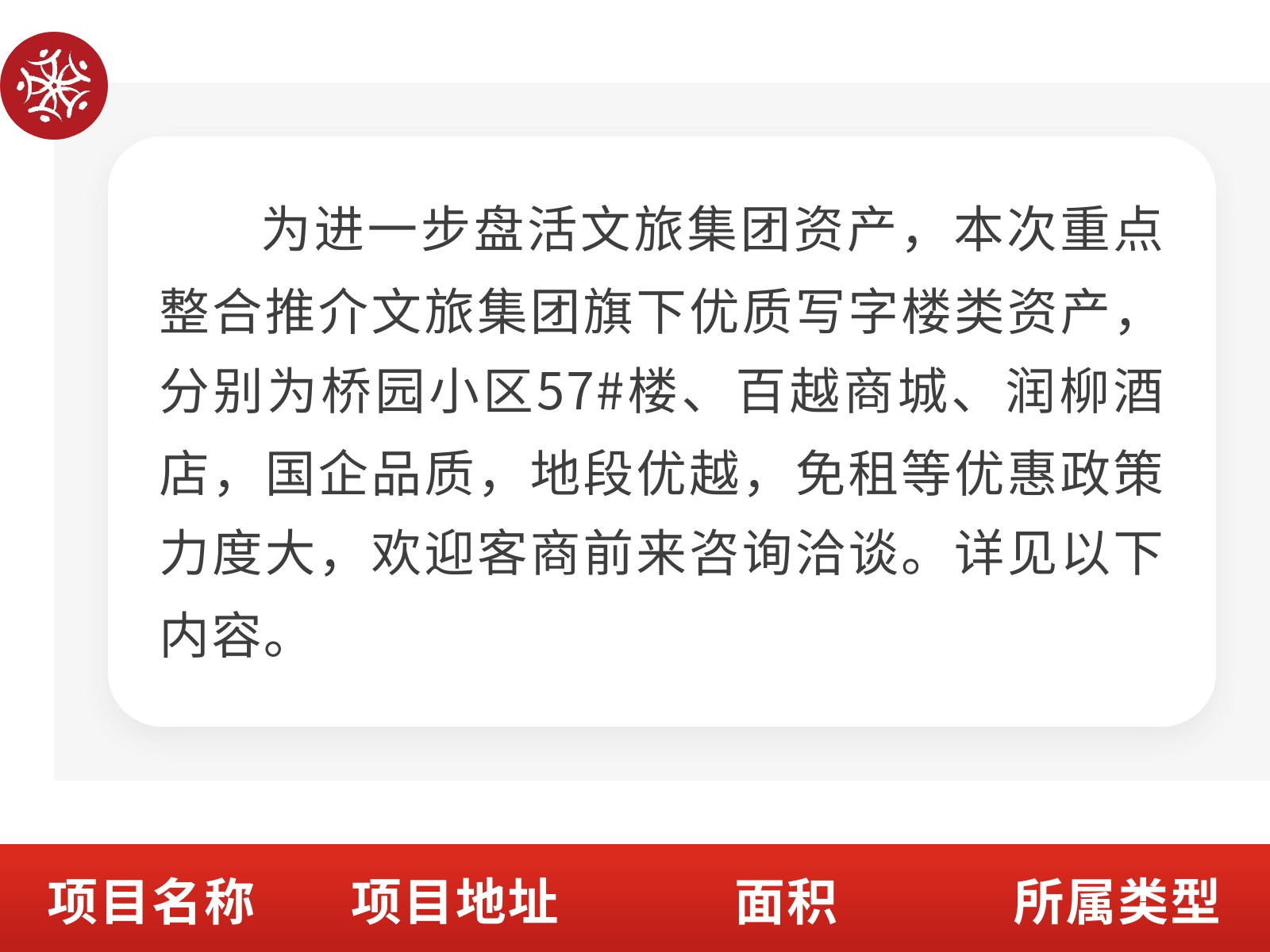 【國(guó)企品質(zhì) 誠(chéng)邀共贏】文旅集團(tuán)寫字樓類優(yōu)質(zhì)資產(chǎn)對(duì)外招租 發(fā)布時(shí)間:2025年09月28日 11時(shí)來源:本站原創(chuàng)瀏覽:79 人次