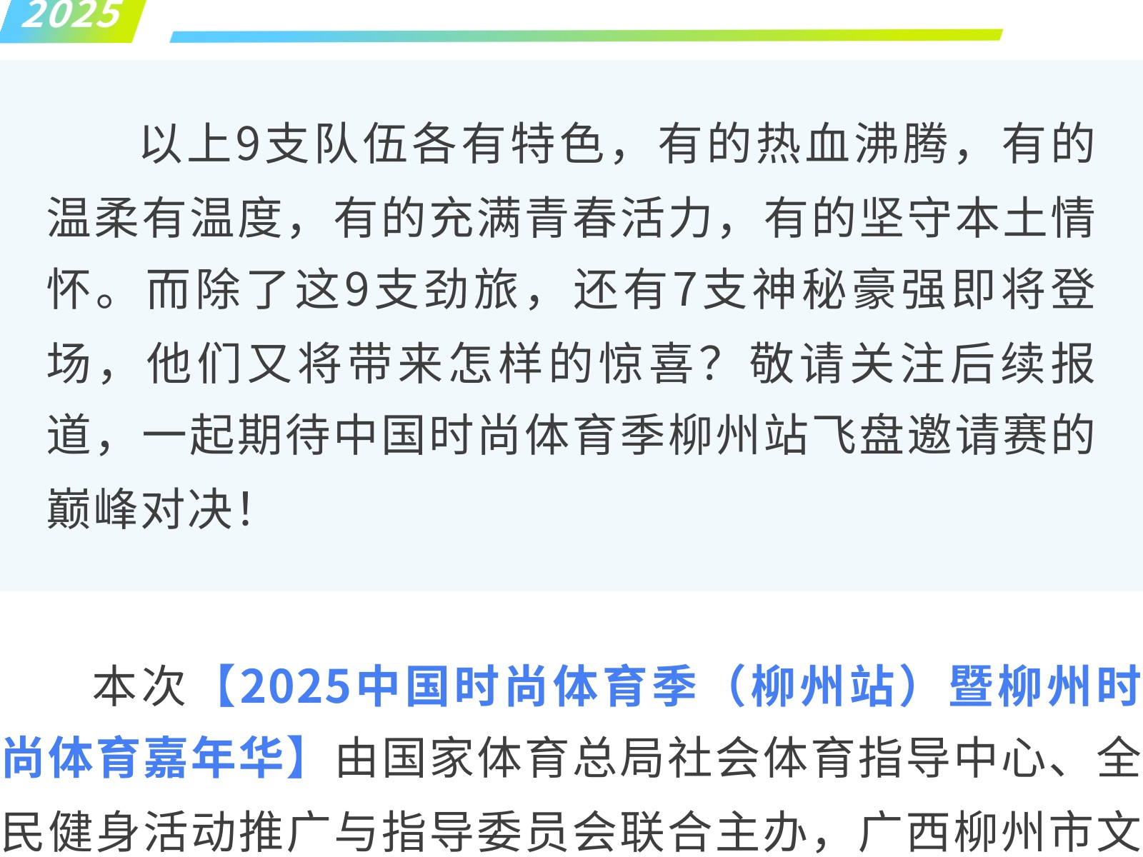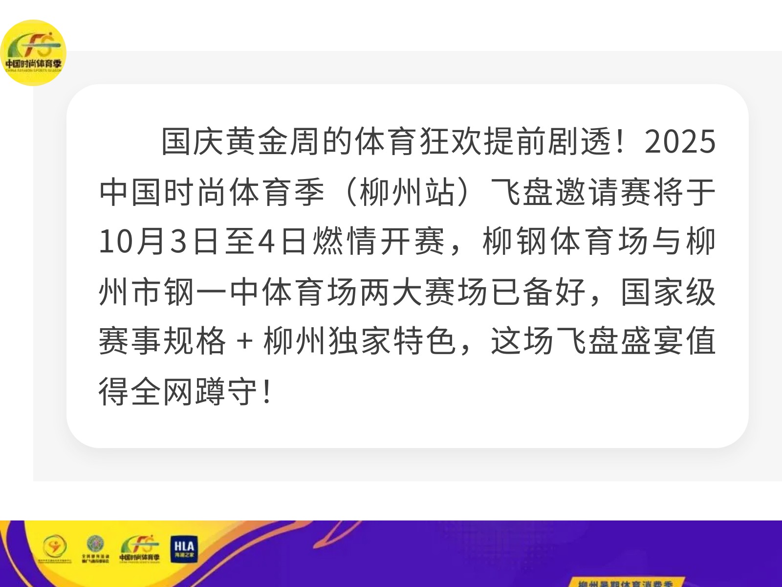燃動柳州!中國時尚體育季飛盤邀請賽16豪強集結,九支勁旅先睹為快 發(fā)布時間:2025年09月30日 16時來源:本站原創(chuàng)瀏覽:65 人次