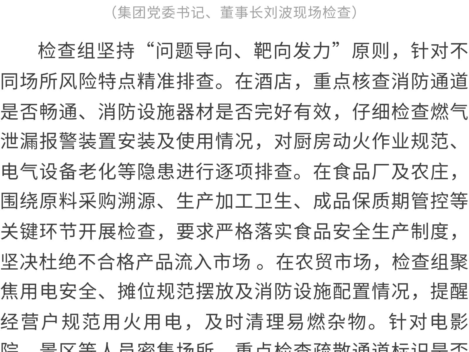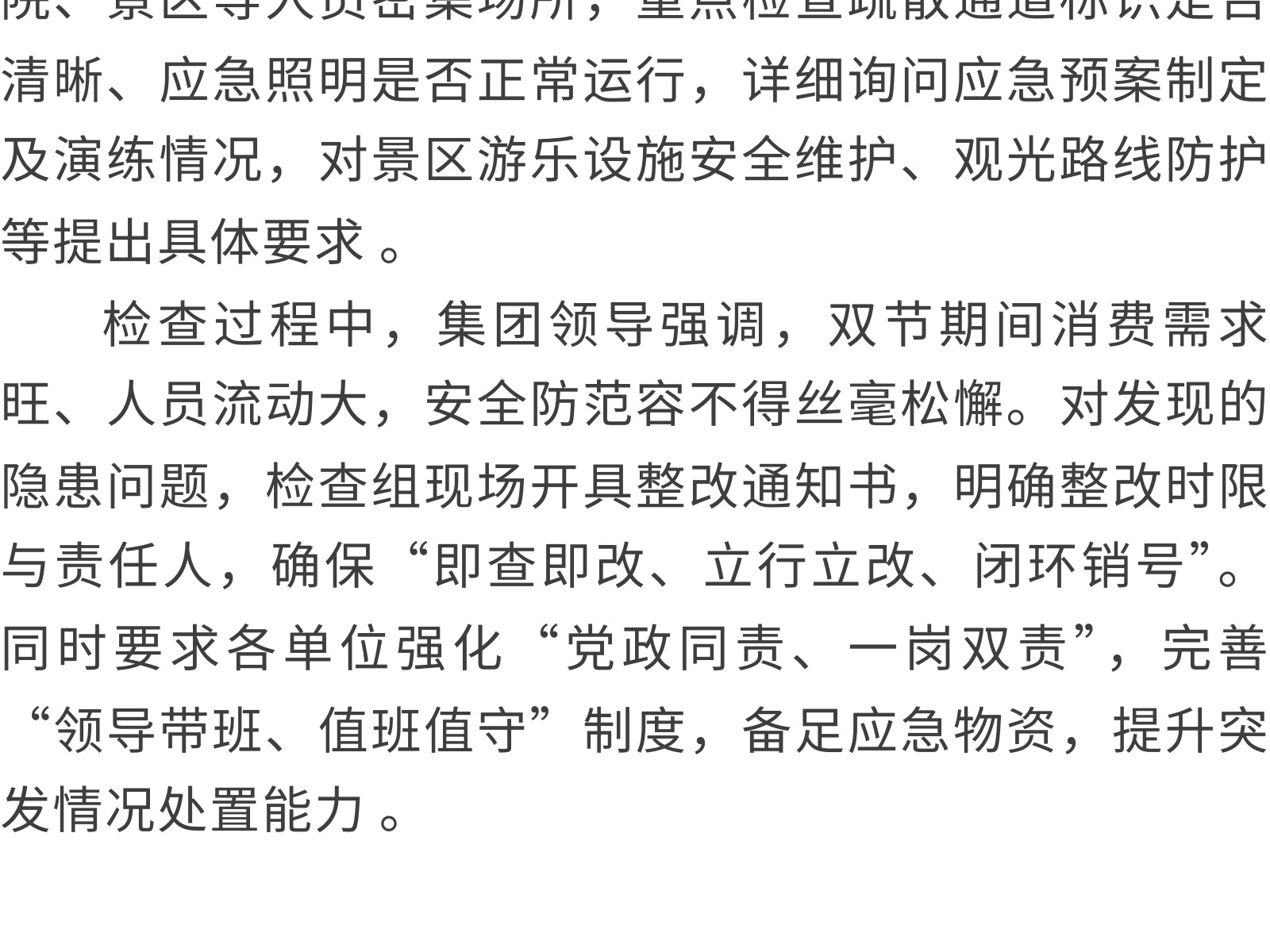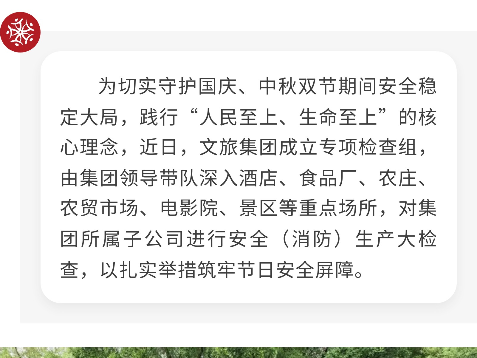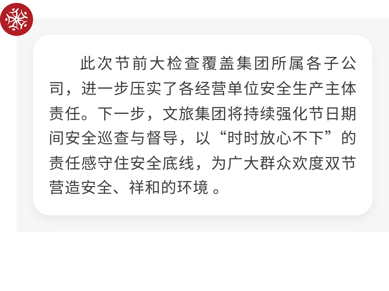 【筑牢安全防線 護(hù)航雙節(jié)安寧】文旅集團(tuán)開展節(jié)前安全(消防)生產(chǎn)大檢查 發(fā)布時(shí)間:2025年09月30日 17時(shí)來源:本站原創(chuàng)瀏覽:71 人次
