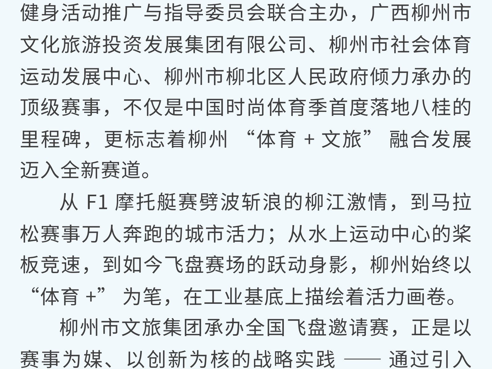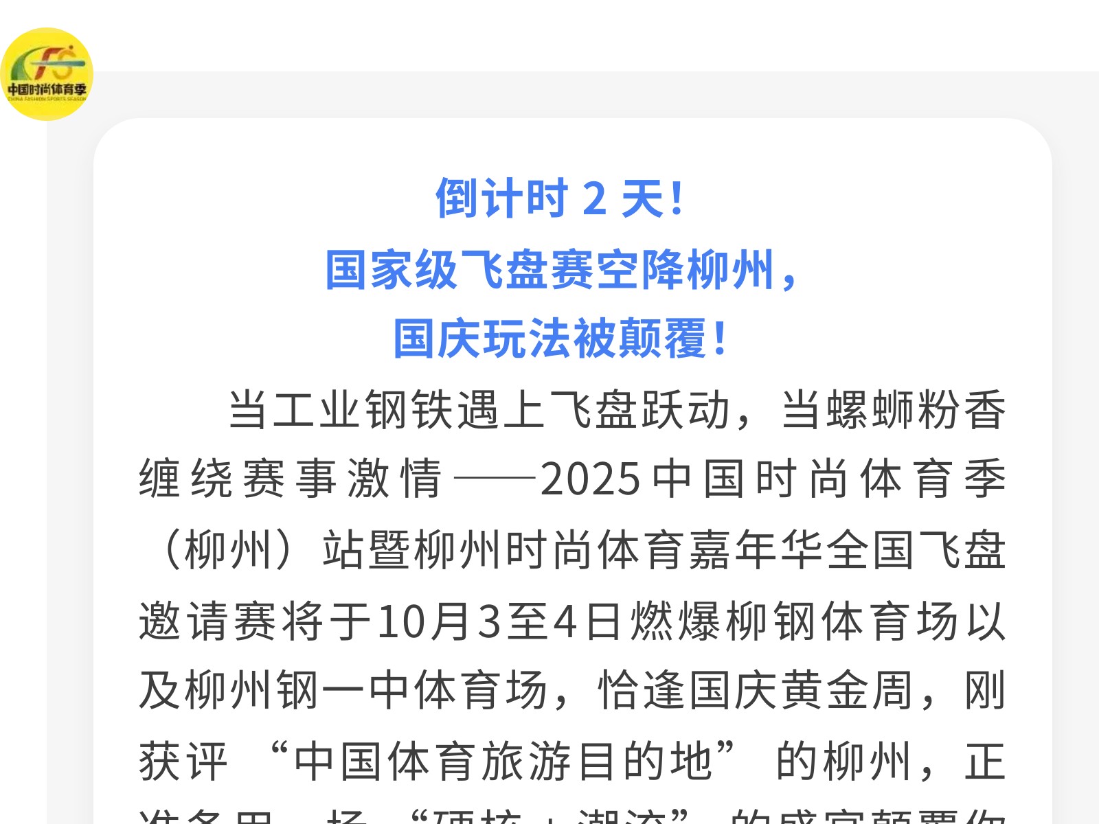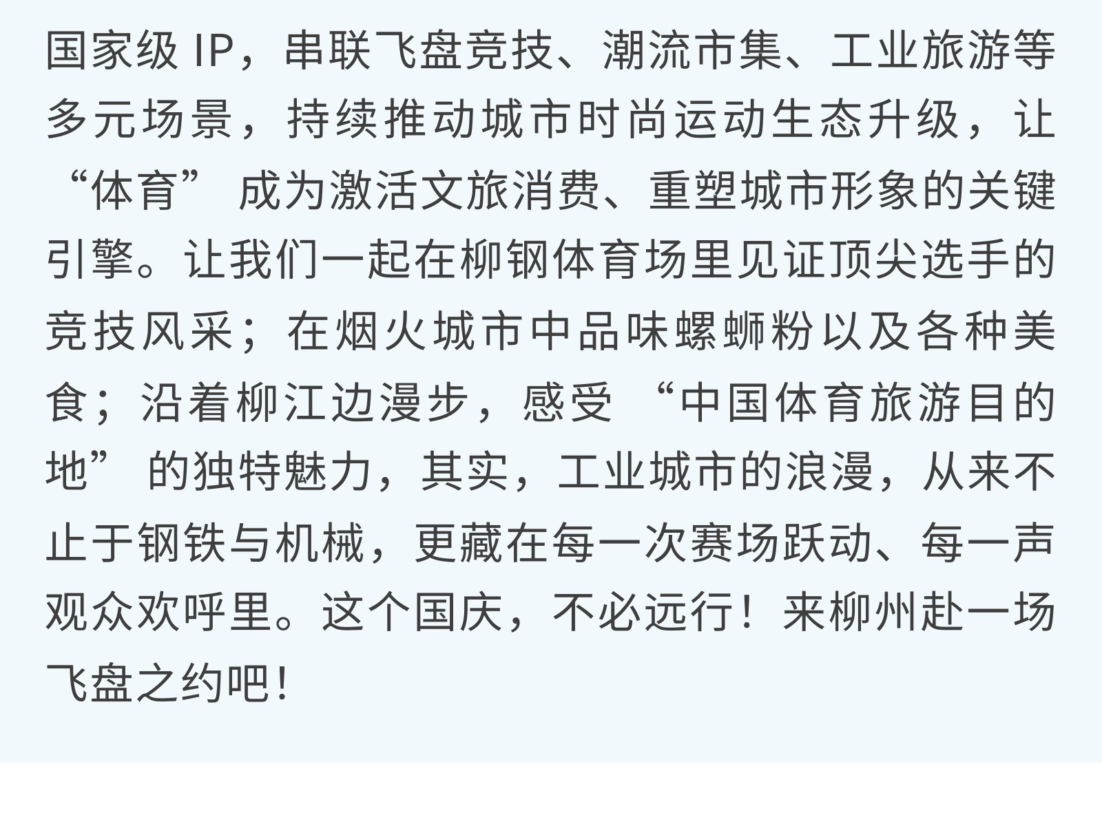國(guó)慶赴柳!鋼鐵賽場(chǎng)飛盤燃,柳州這座體育旅游之城藏不住了 發(fā)布時(shí)間:2025年10月02日 17時(shí)來(lái)源:本站原創(chuàng)瀏覽:49 人次