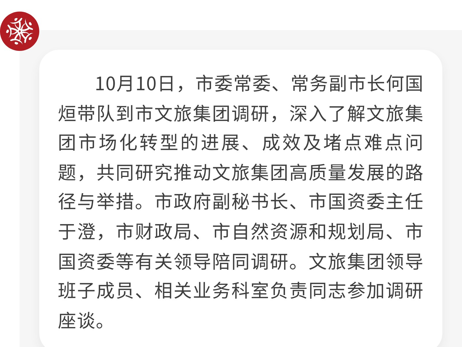 市委常委、常務(wù)副市長何國烜到市文旅集團調(diào)研 發(fā)布時間:2025年10月11日 15時來源:本站原創(chuàng)瀏覽:43 人次
