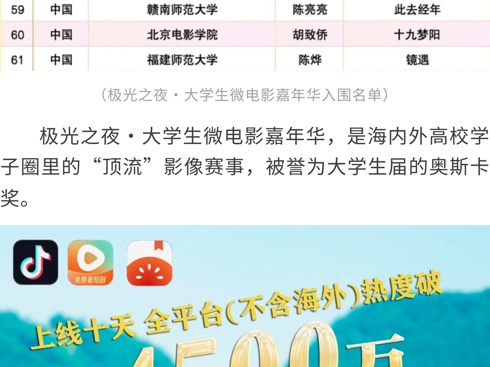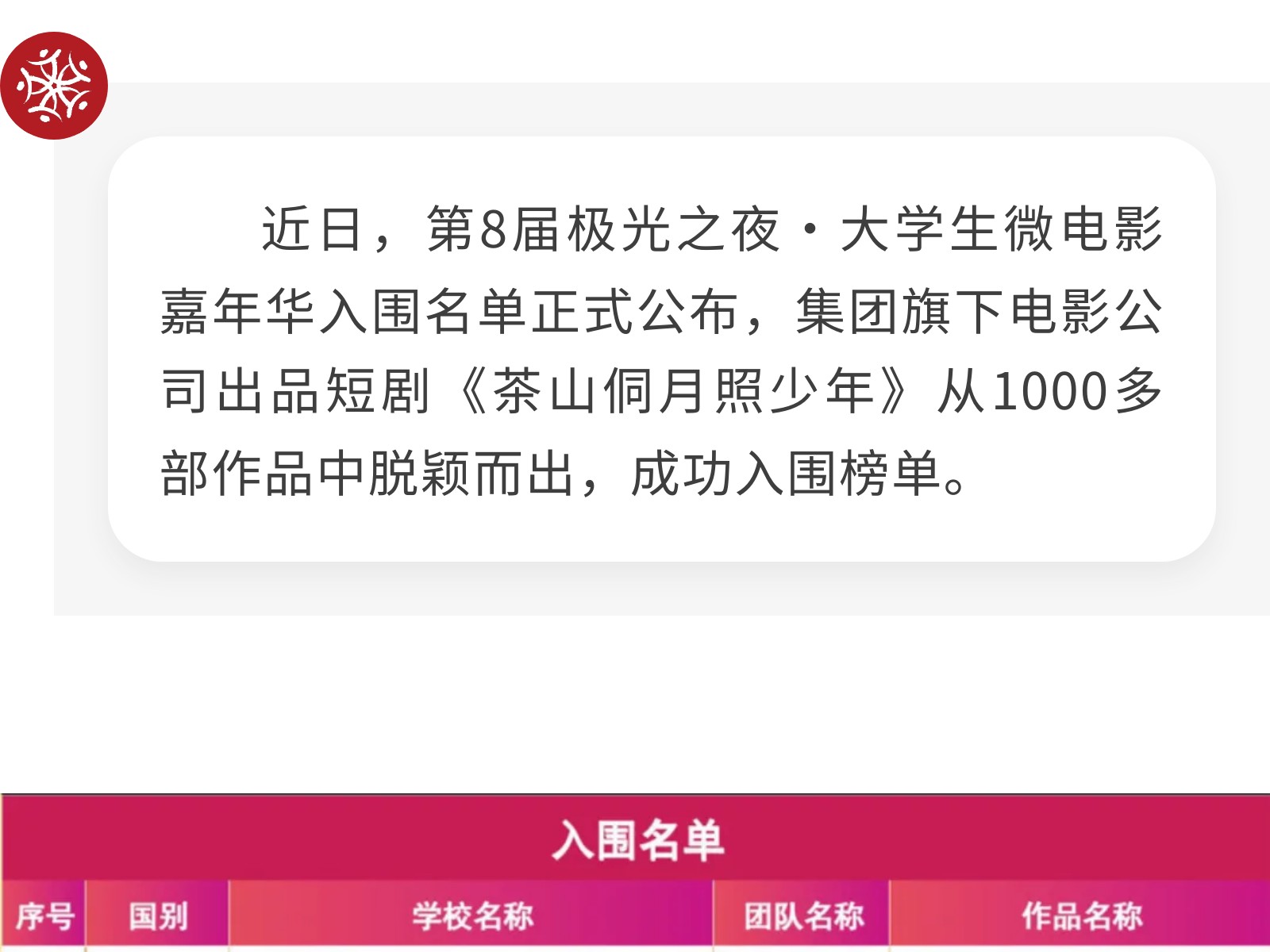 喜報(bào)!集團(tuán)旗下電影公司出品短劇《茶山侗月照少年》入圍第8屆極光之夜·大學(xué)生微電影嘉年華 發(fā)布時(shí)間:2025年10月14日 15時(shí)來(lái)源:本站原創(chuàng)瀏覽:40 人次