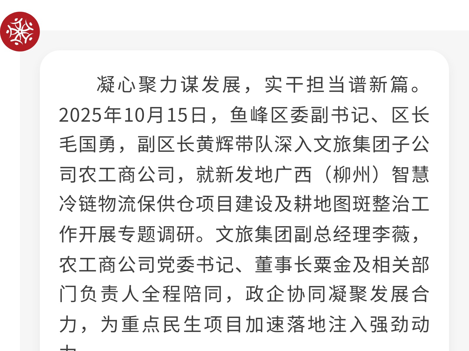 魚(yú)峰區(qū)政府主要領(lǐng)導(dǎo)深入調(diào)研指導(dǎo) 文旅集團(tuán)農(nóng)工商公司全力推進(jìn)重點(diǎn)民生項(xiàng)目落地 發(fā)布時(shí)間:2025年10月16日 09時(shí)來(lái)源:本站原創(chuàng)瀏覽:37 人次