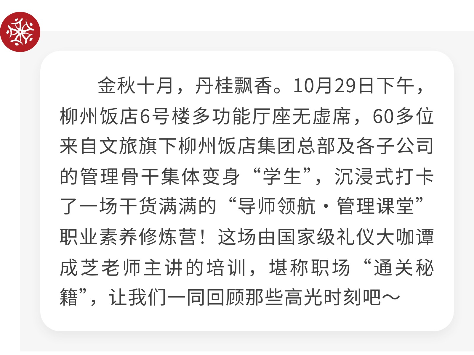 柳州飯店集團“導師領航·管理課堂”職業(yè)素養(yǎng)修煉營圓滿舉辦 發(fā)布時間:2025年10月31日 10時來源:本站原創(chuàng)瀏覽:28 人次