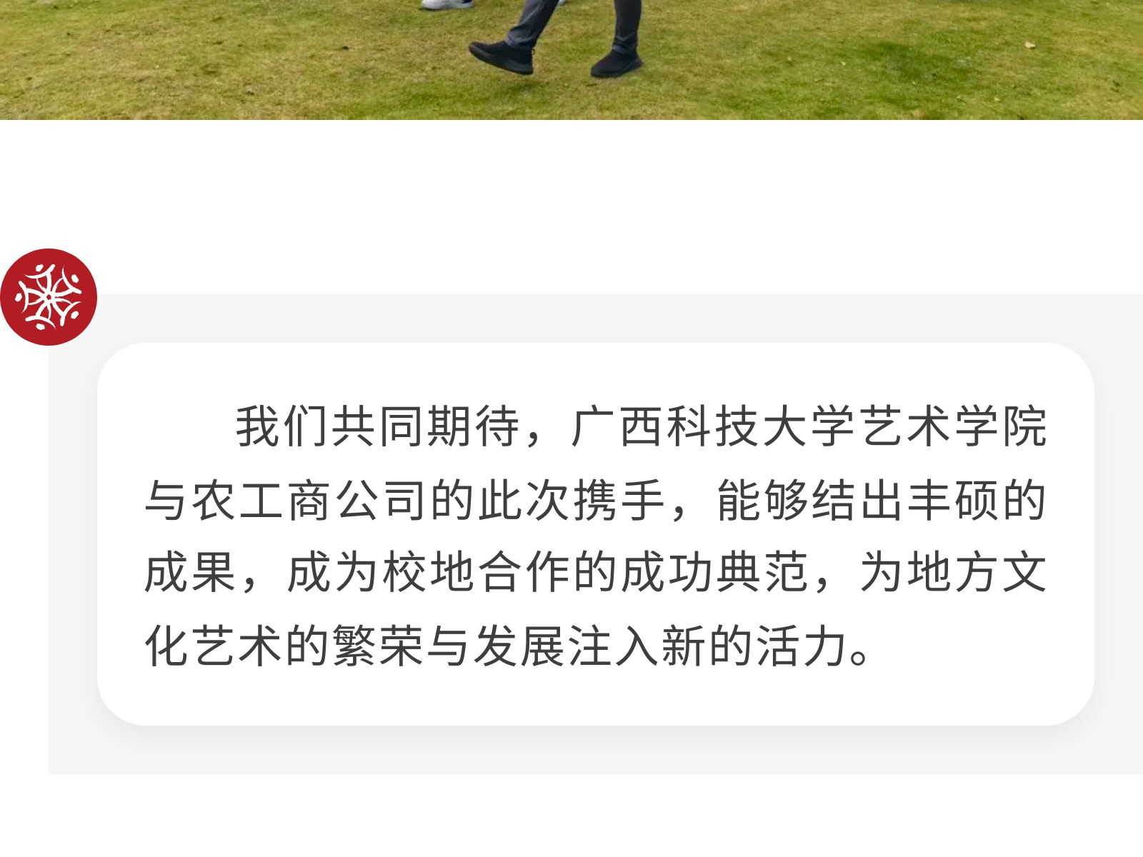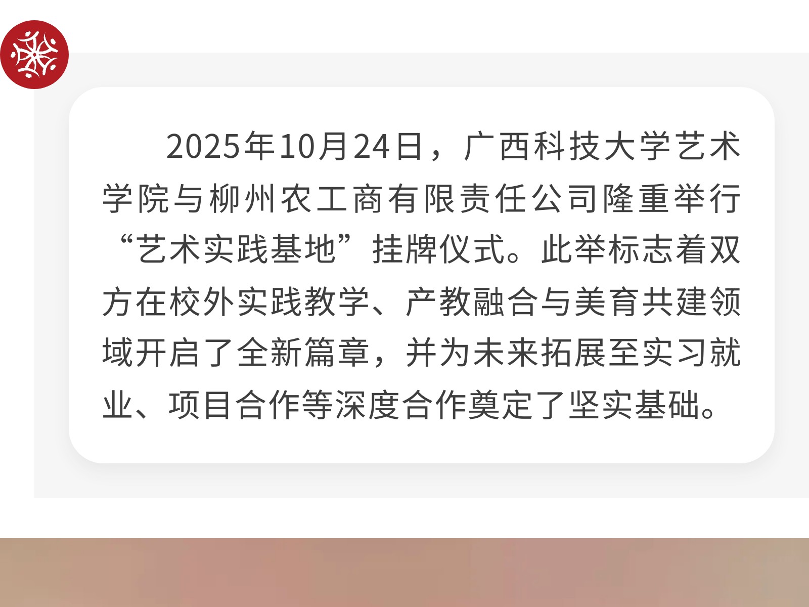 【校企攜手 共育英才】廣西科技大學(xué)藝術(shù)學(xué)院與柳州農(nóng)工商公司正式簽署校企合作協(xié)議 發(fā)布時(shí)間:2025年11月02日 10時(shí)來源:本站原創(chuàng)瀏覽:32 人次