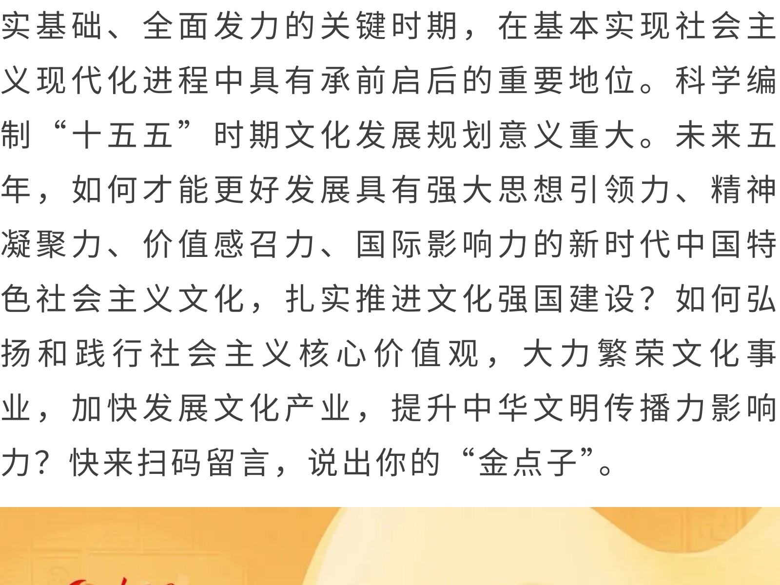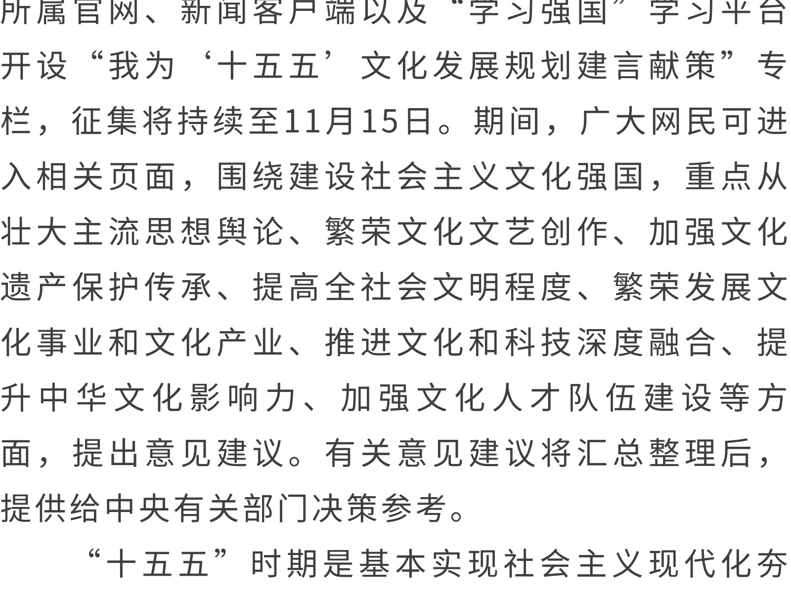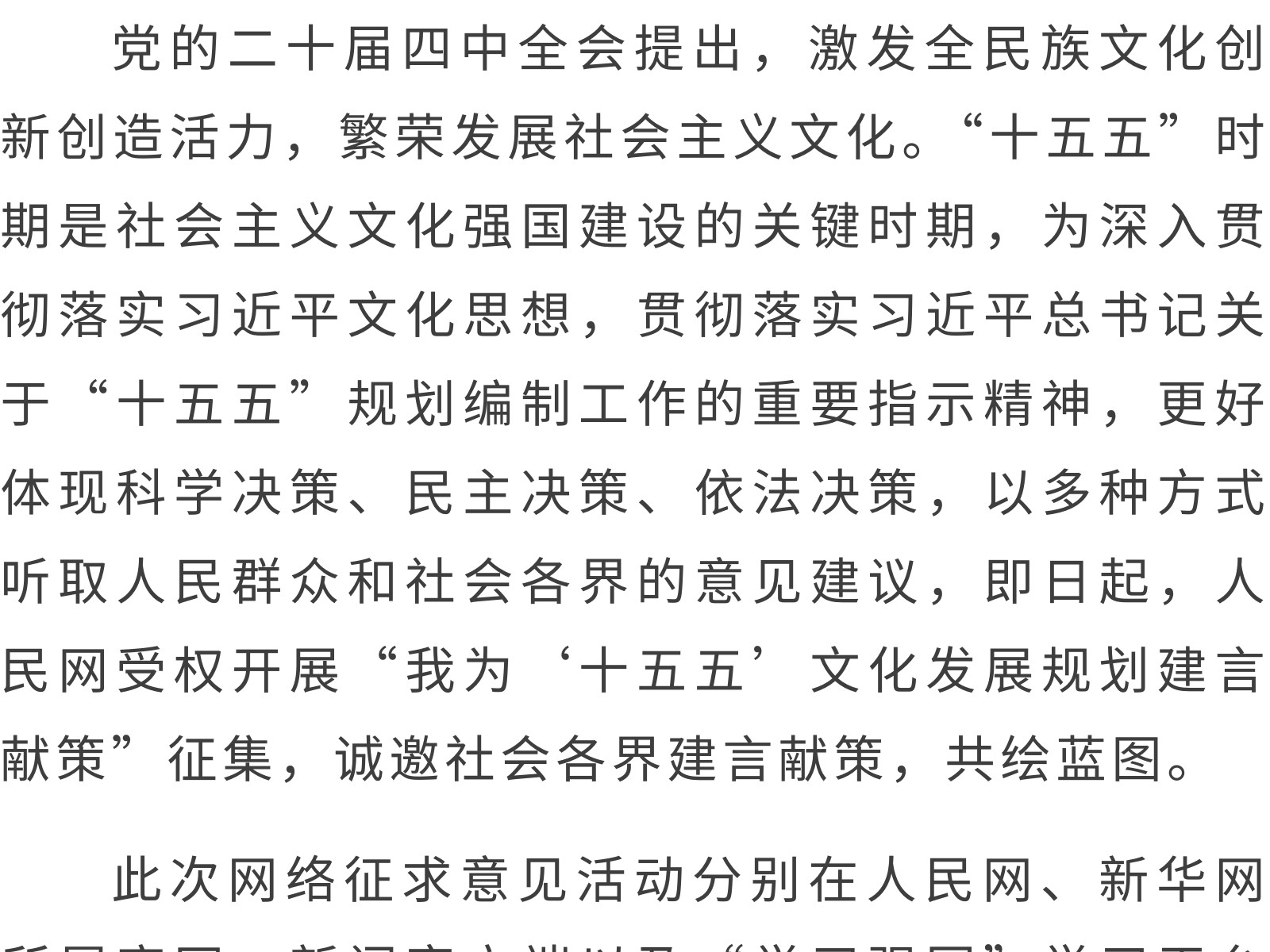 “十五五”文化發(fā)展規(guī)劃編制工作開展網(wǎng)絡(luò)征求意見活動 發(fā)布時間:2025年11月11日 11時來源:本站原創(chuàng)瀏覽:48 人次