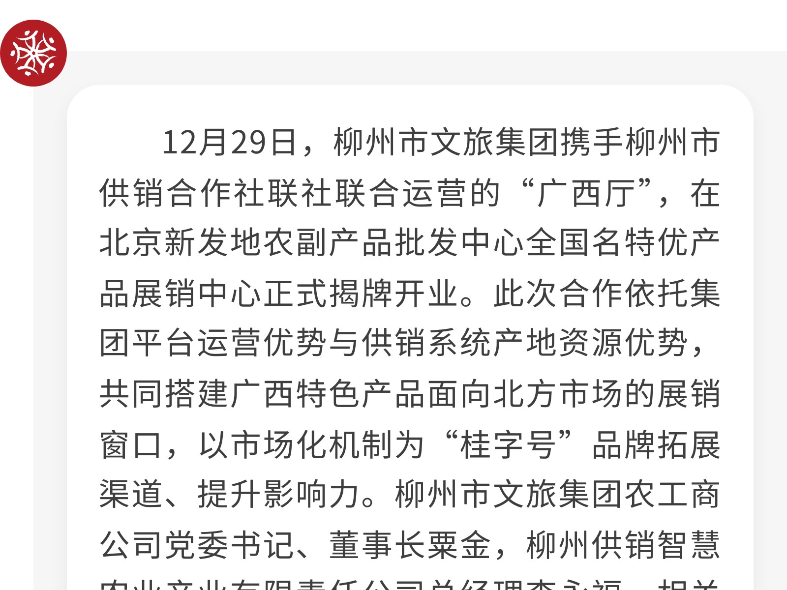 文旅集團(tuán)北京新發(fā)地廣西廳隆重揭牌開業(yè)——打造桂品入京新窗口 助力區(qū)域經(jīng)濟(jì)協(xié)同發(fā)展 發(fā)布時(shí)間:2025年12月30日 11時(shí)來(lái)源:本站原創(chuàng)瀏覽:78 人次