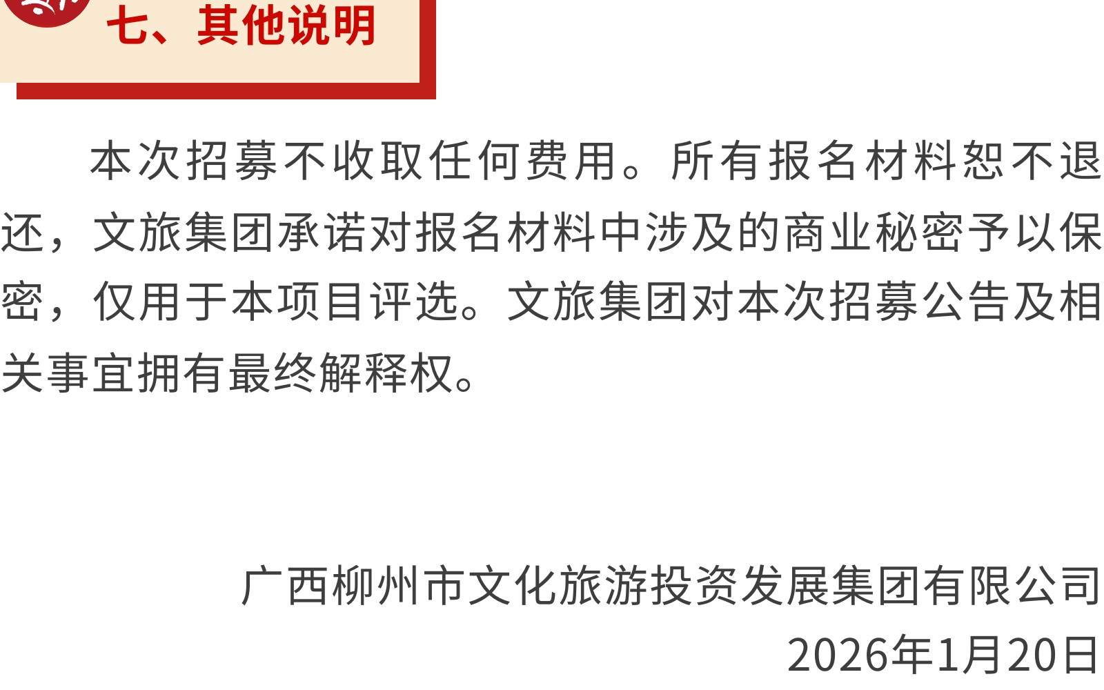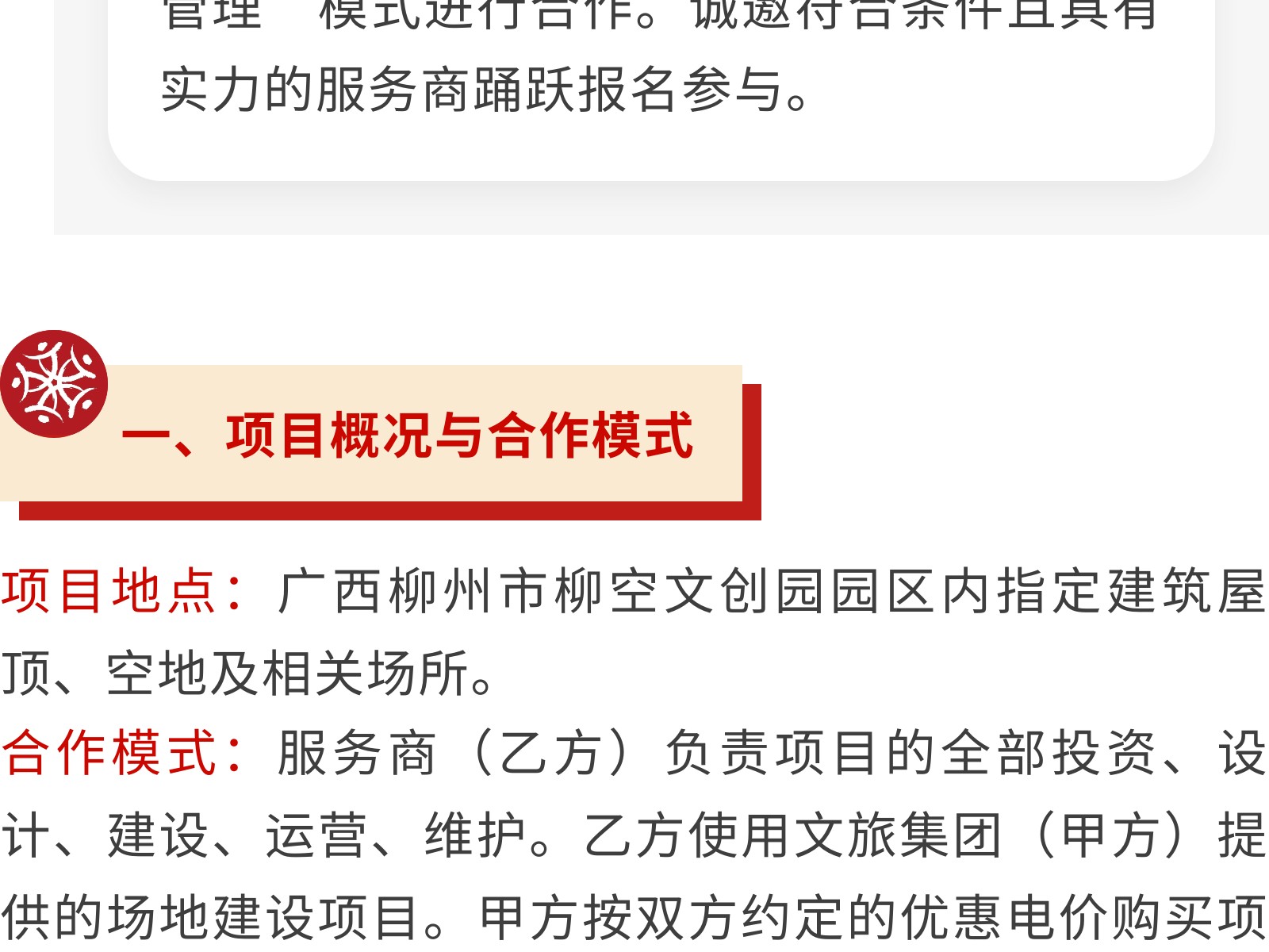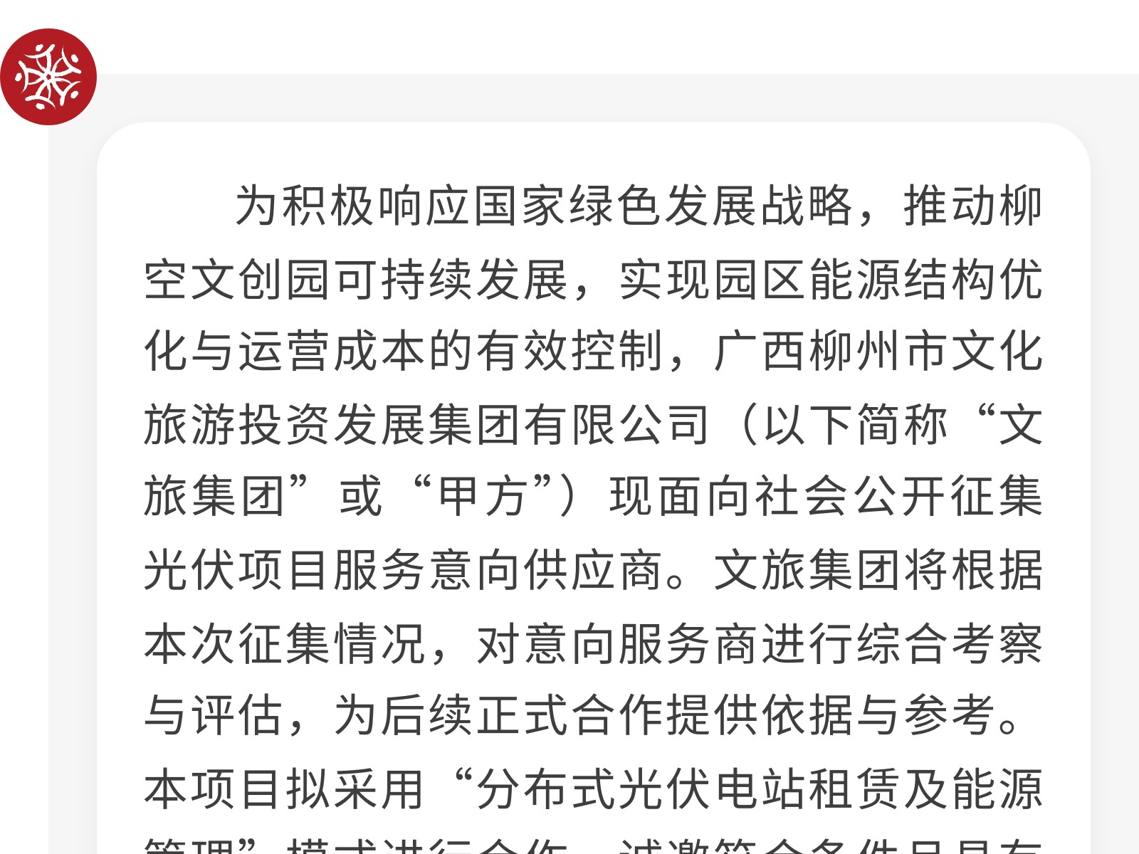 廣西柳州市文化旅游投資發(fā)展集團(tuán)有限公司關(guān)于為柳空文創(chuàng)園公開(kāi)招募光伏項(xiàng)目意向服務(wù)商的公告 發(fā)布時(shí)間:2026年01月22日 12時(shí)來(lái)源:本站原創(chuàng)瀏覽:42 人次
