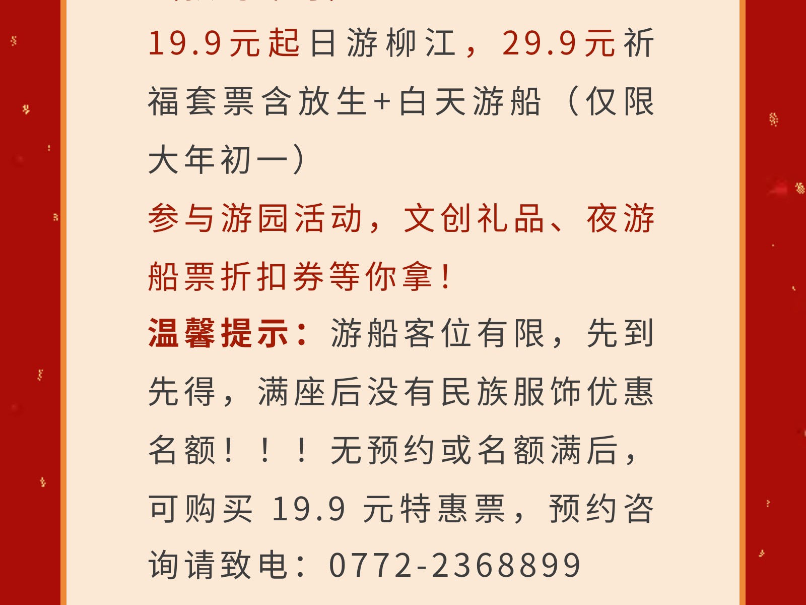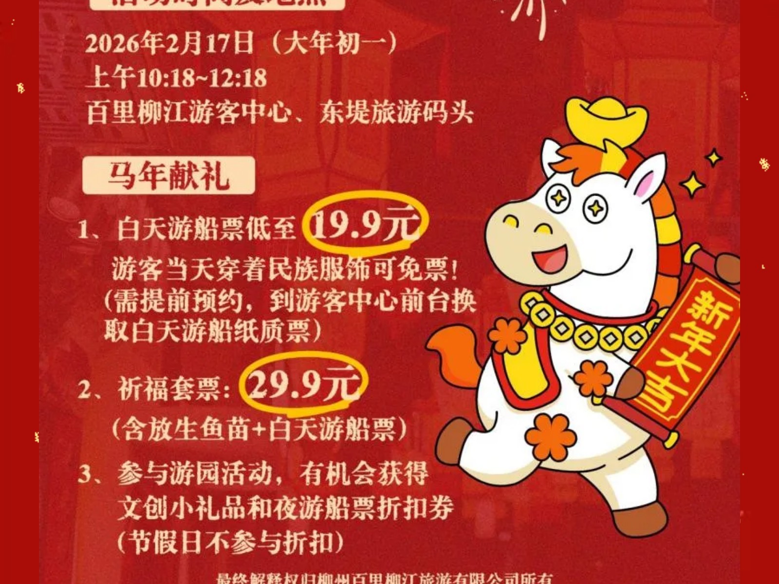 穿民族服飾=免船票!解鎖百里柳江景區(qū)大年初一“薅羊毛”的正確姿勢! 發(fā)布時間:2026年01月26日 12時來源:本站原創(chuàng)瀏覽:45 人次