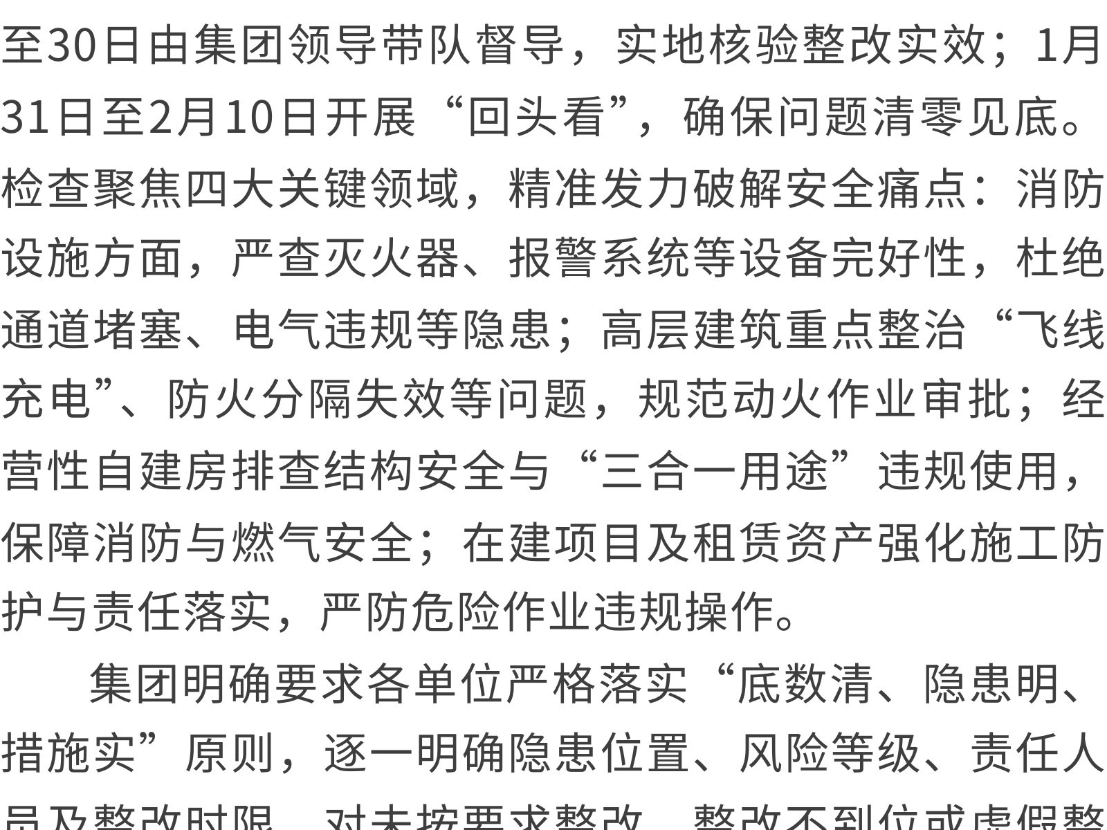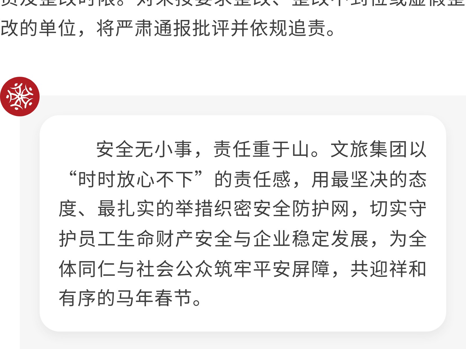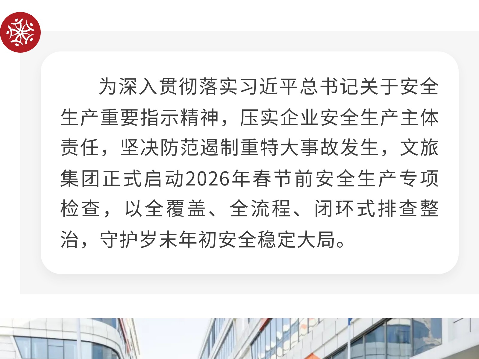 筑牢安全防線 護(hù)航馬年新春——文旅集團(tuán)啟動2026年春節(jié)前安全生產(chǎn)專項(xiàng)檢查 發(fā)布時(shí)間:2026年02月03日 15時(shí)來源:本站原創(chuàng)瀏覽:59 人次