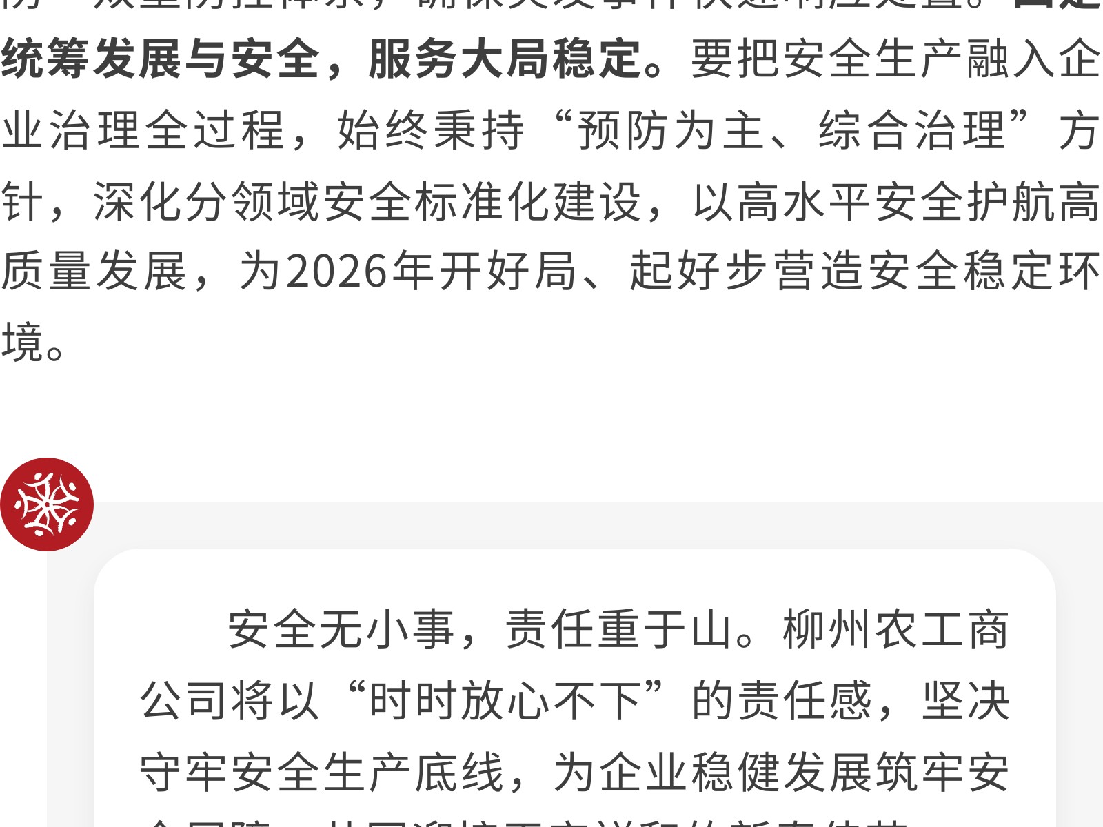 壓緊責(zé)任鏈條,筑牢歲末年初安全防線——柳州農(nóng)工商公司召開2025年度安全生產(chǎn)總結(jié)會(huì) 發(fā)布時(shí)間:2026年02月06日 12時(shí)來源:本站原創(chuàng)瀏覽:21 人次
