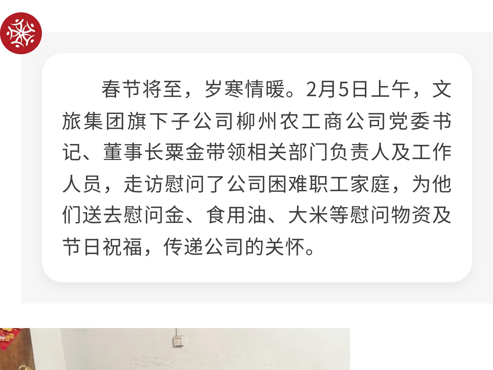 關懷暖寒冬 真情潤心田——柳州農(nóng)工商公司工會組織開展困難職工走訪慰問活動 發(fā)布時間:2026年02月06日 12時來源:本站原創(chuàng)瀏覽:17 人次